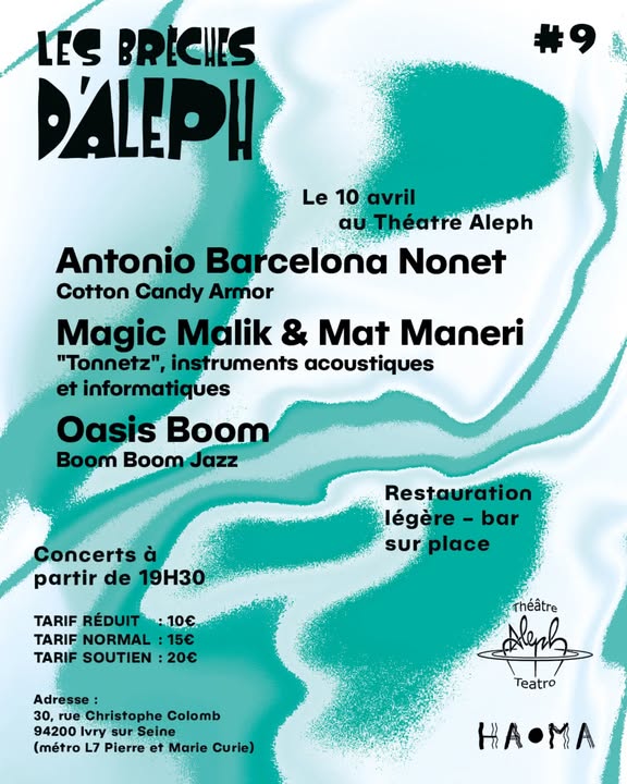 Les Brèches d'Aleph, c'est l'association de cœur, d'esprit et de labeur de la Cie Haoma (collectif de jazz étendu dans toute la largeur de ce vaste mot), du Théâtre Aleph et de divers collectifs de musiques improvisées, originaires d'amples et multiples horizons, pour organiser des soirées de concert, et pourquoi pas d'autres formes artistiques ou de réflexion au passage.